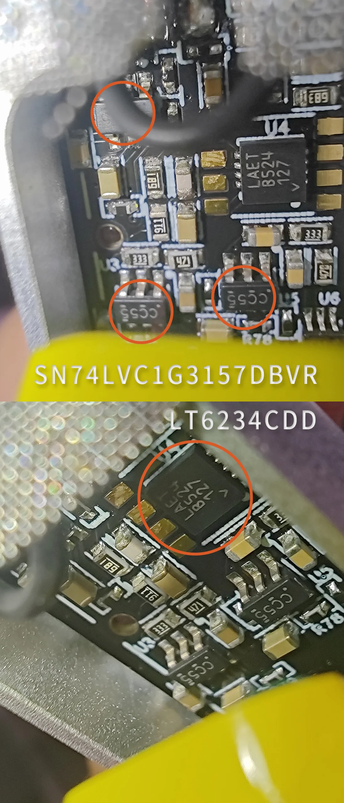 主要的能找到参数的芯片已经标记在图中,核心采用 一颗 14mm 咪头,电池为一颗 18490,运放为ADI LT6234(似乎是主板上最贵的芯片),DFN 8封装, 周边还留了个额外焊盘。高低切、增益切换开关应该是通过三颗SN74LVC1G3157DBVR。